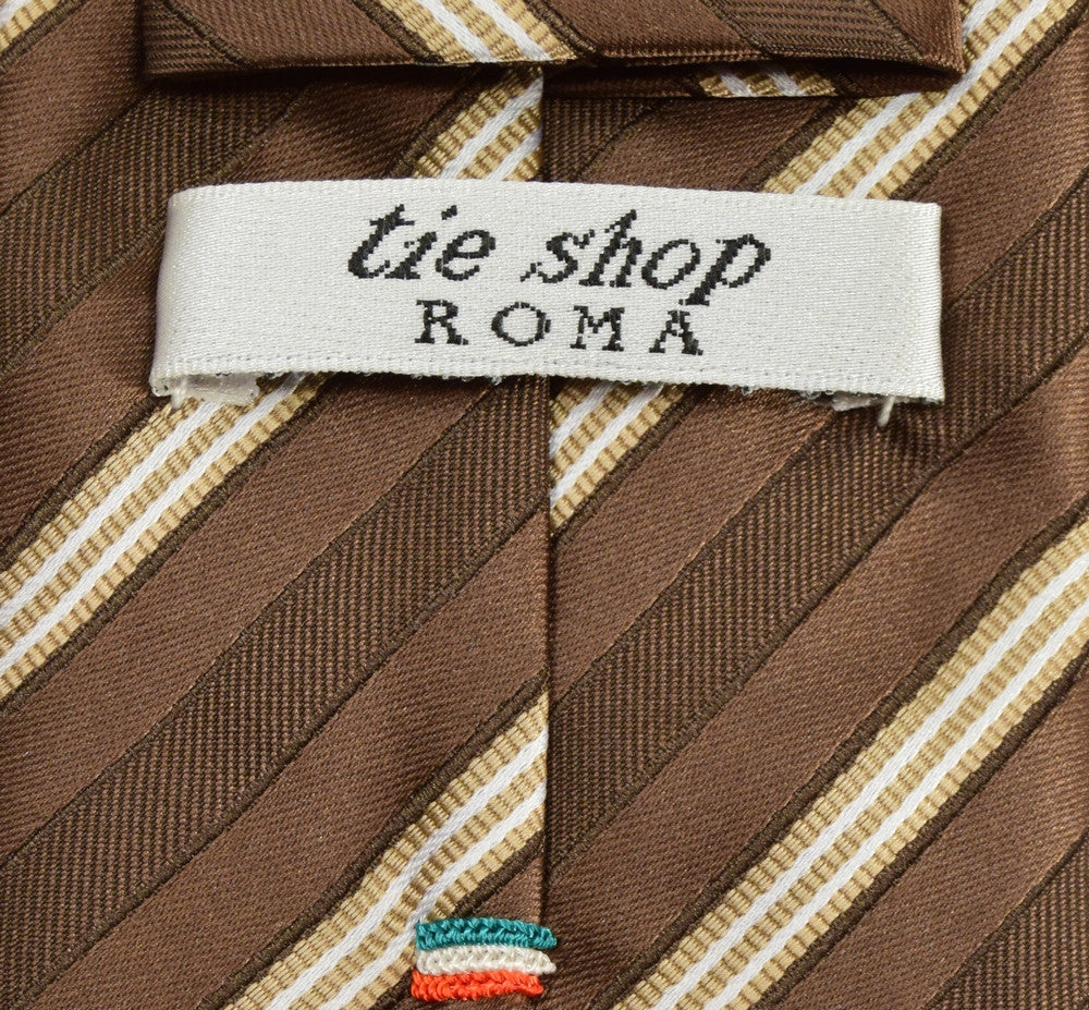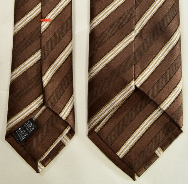 OLD COPPER BROWN, TAN YELLOW, AND WHITE STRIPES, SEVEN FOLDS SILK LIMITED EDITION NECKTIE, REGIMENTAL, TWILL FABRIC WEAVE - ONLY ONE AVAILABLE ONLINE!
