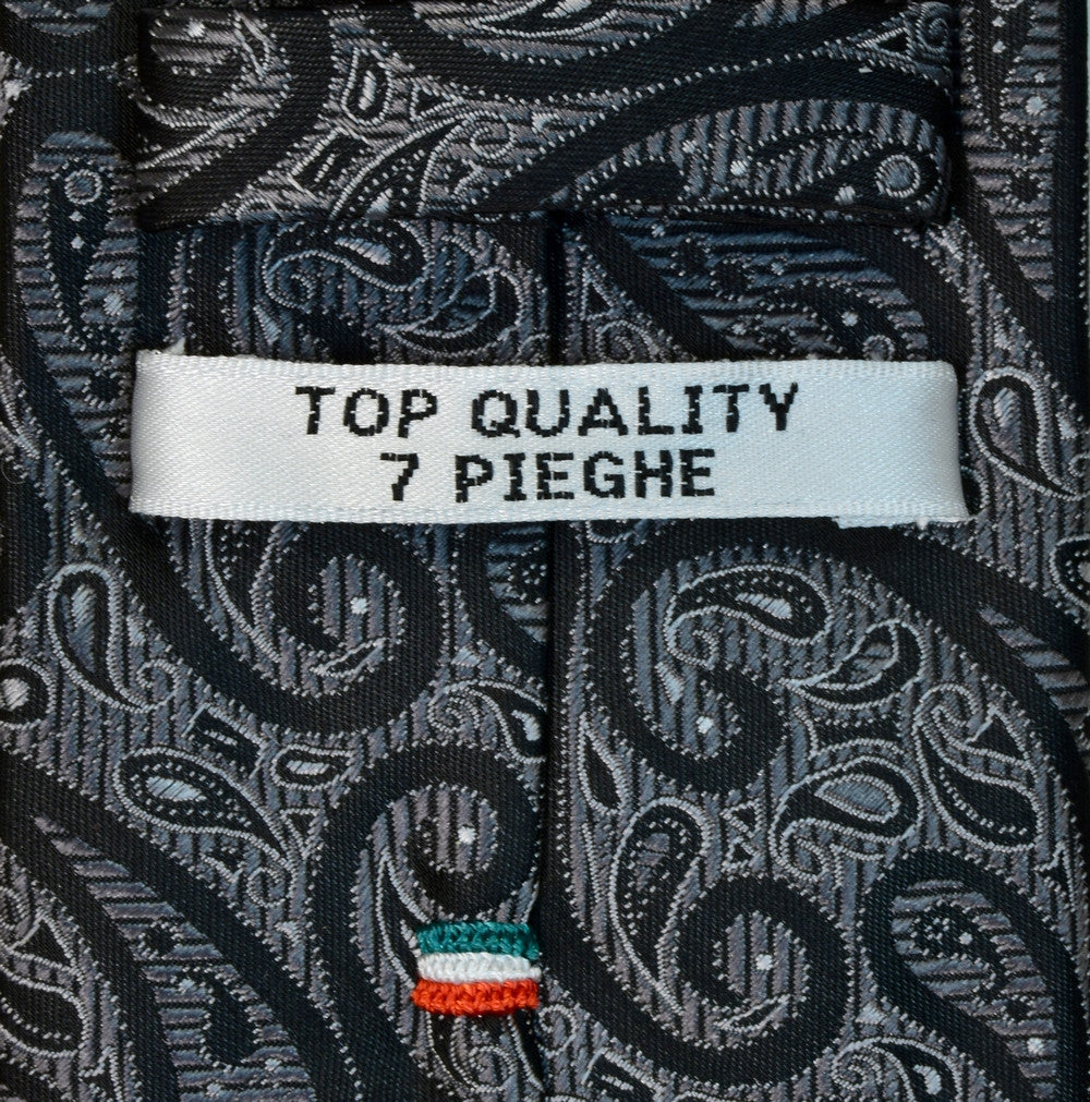 RAVEN GRAY, LIGHT GRAY AND LIQUORICE SEVEN FOLDS SILK LIMITED EDITION NECKTIE, PAISLEY MOTIFS, JACQUARD FABRIC WEAVE - ONLY 1 PIECE AVAILABLE ONLINE!