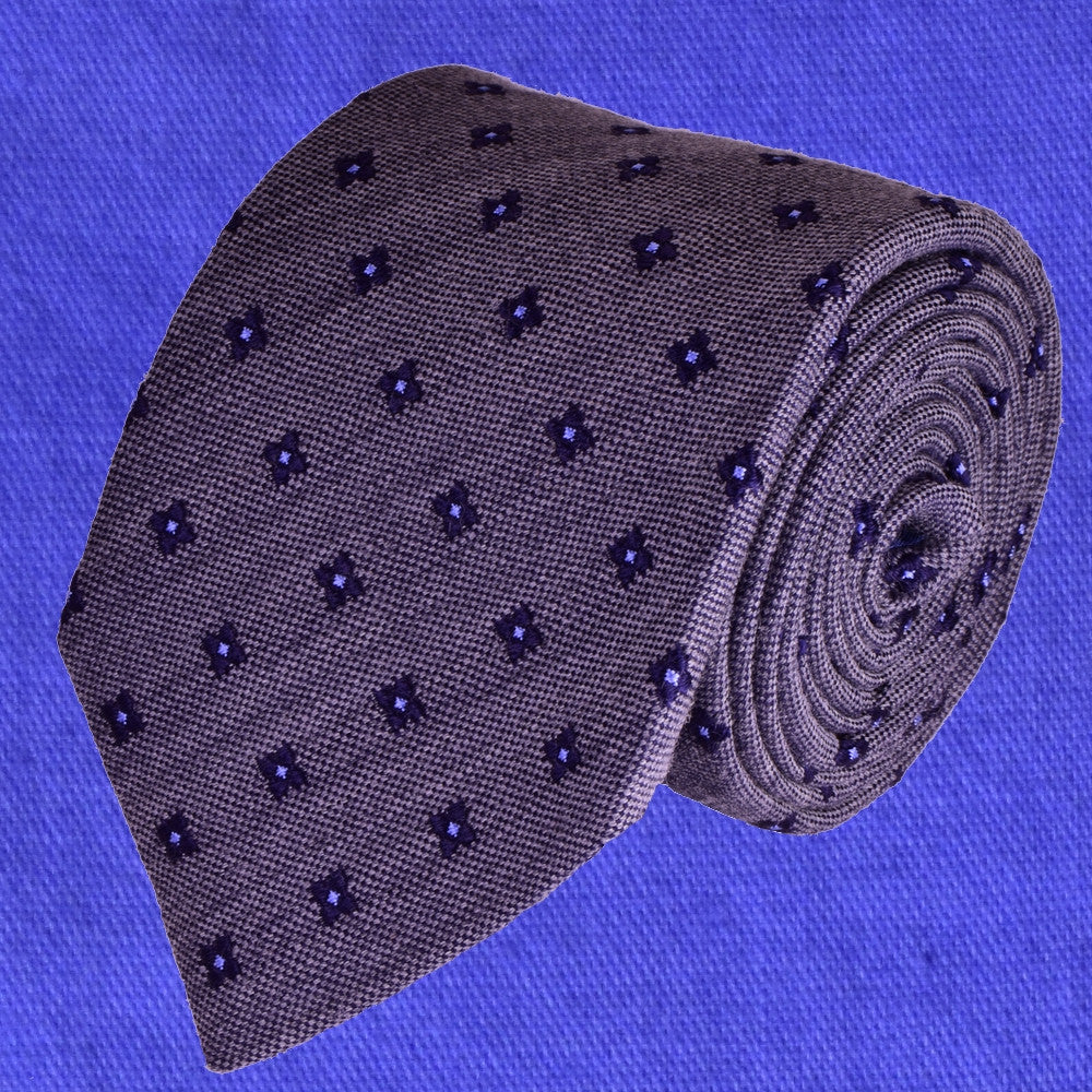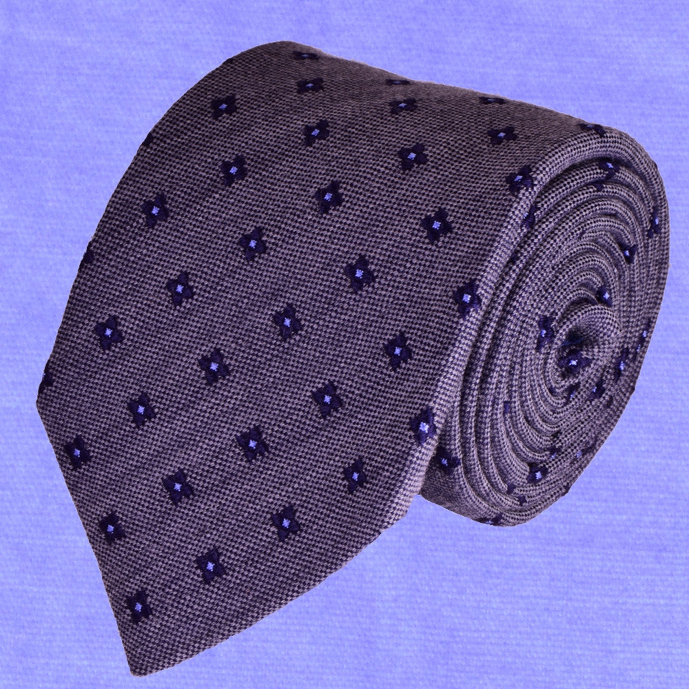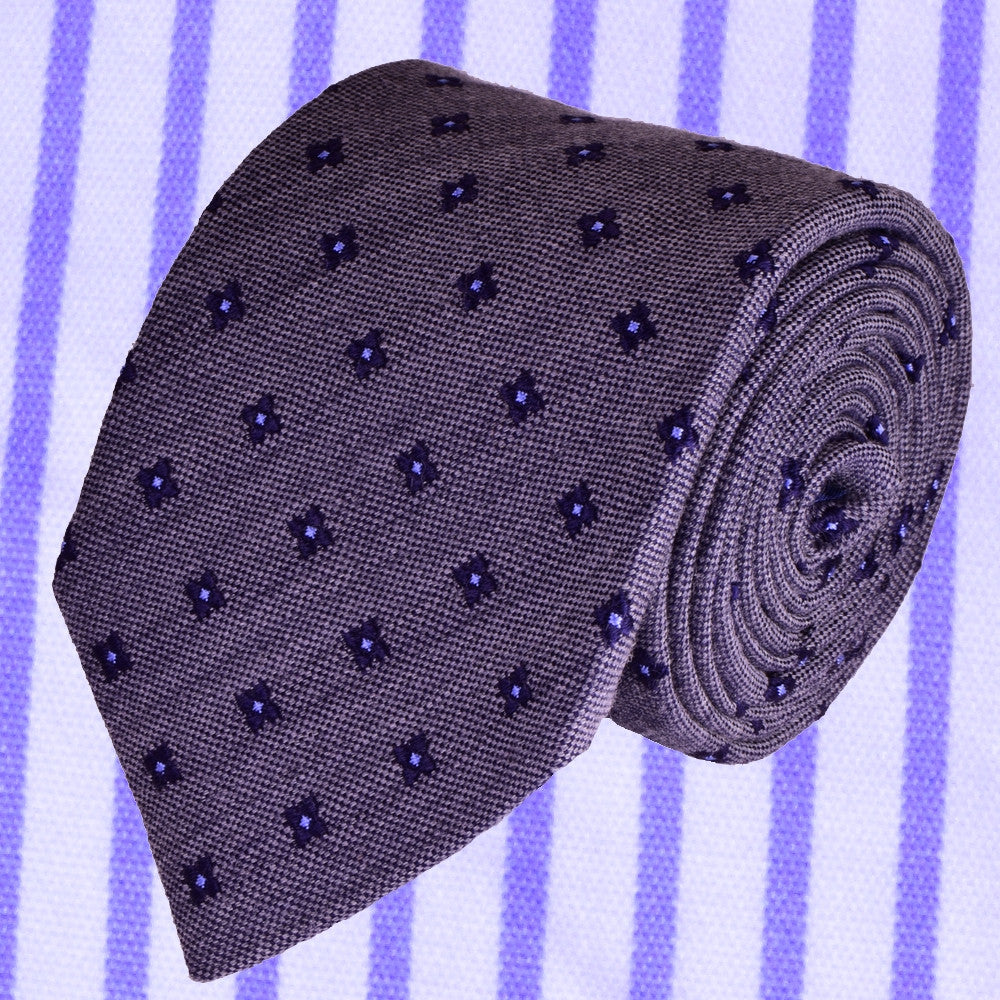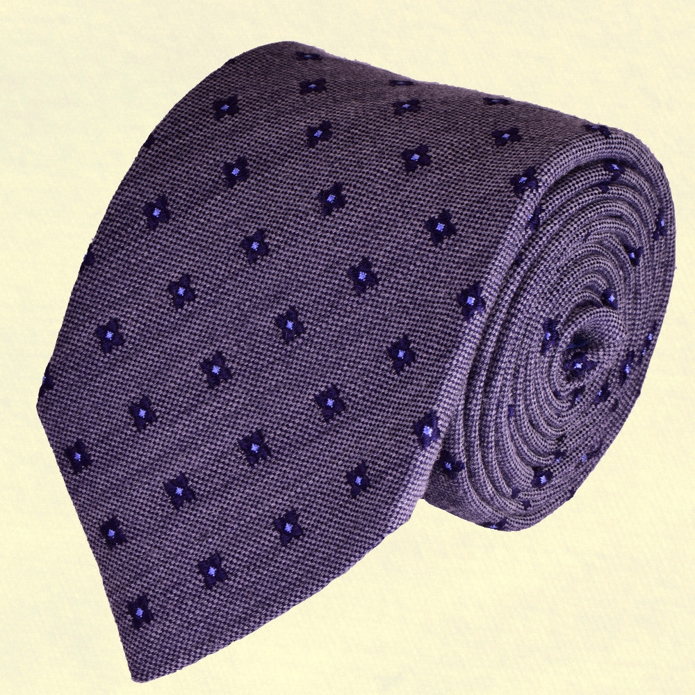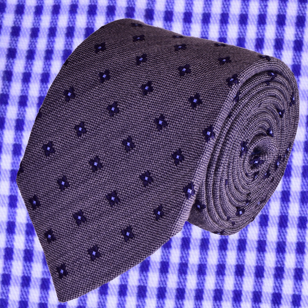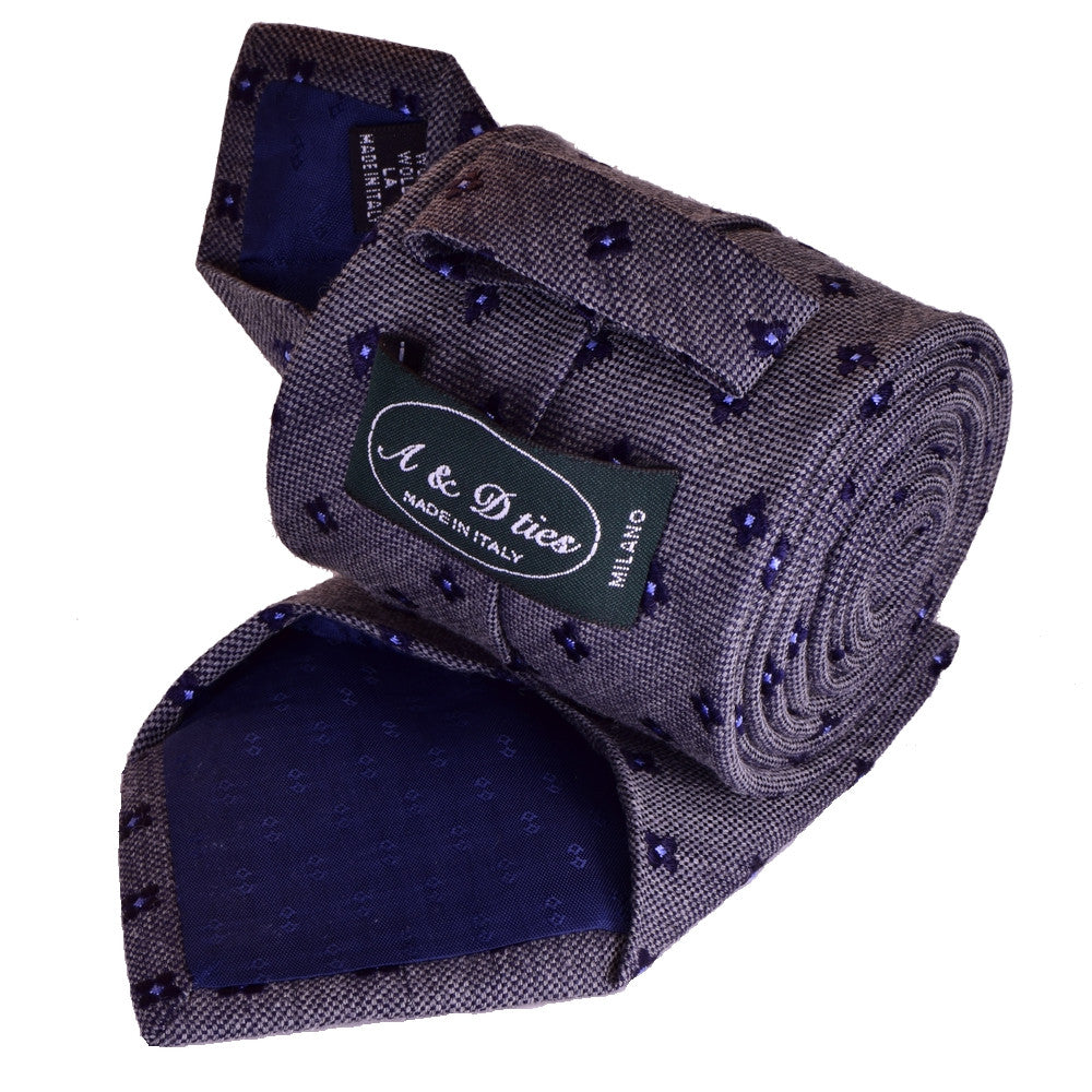 KYMBERLY-GREY, WOOL NECKTIE HANDMADE IN ITALY, BLACK-CURRANT AND MEDIUM PURPLE FLOWER MOTIFS - BASKETWEAVE FABRIC - CRAVATTA IN LANA FATTA A MANO IN ITALIA, GRIGIO KIMBERLY, MOTIVI FLOREALI RIBES E AZZURRO/VIOLA, FINITURA A CANESTRO - TIESHOPROME
