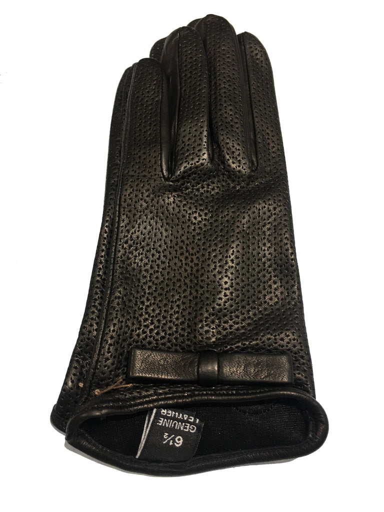 LIMITED EDITION, PERFORATED WOMEN BLACK LEATHER GLOVES WITH BOWS, SILK LINER, MADE IN ITALY