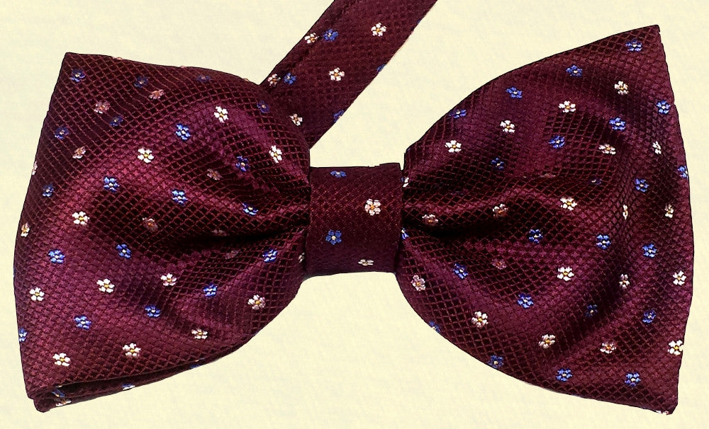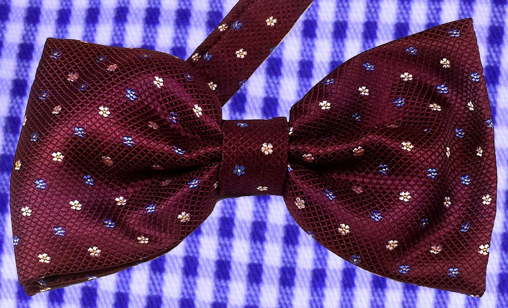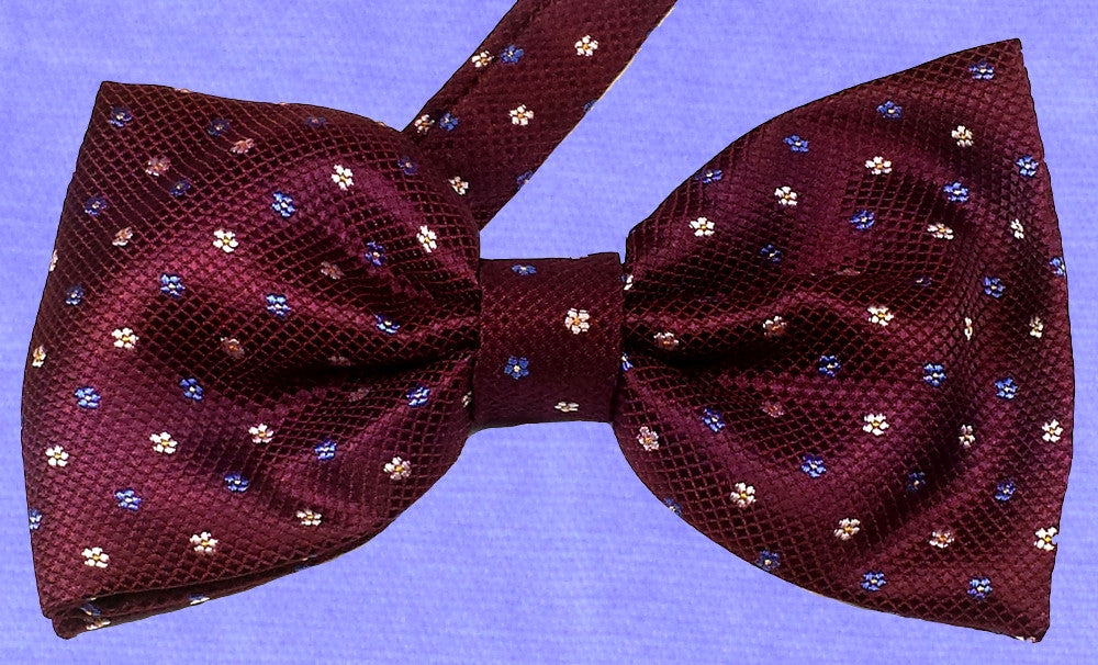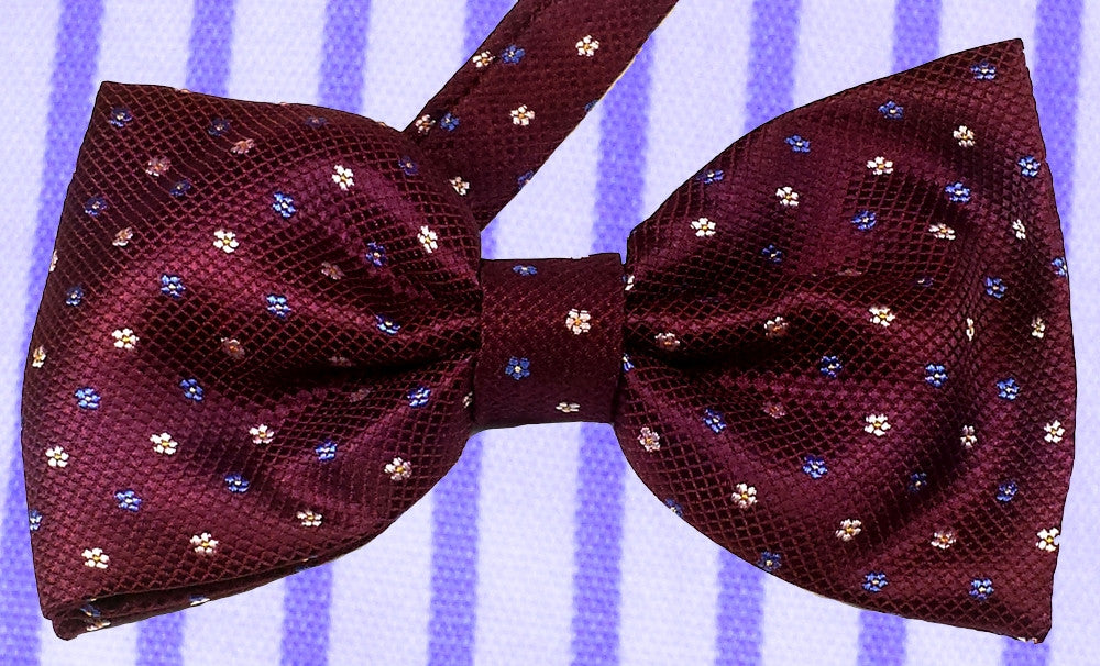 SIREN BURGUNDY, MARGUERITE BLUE, WHITE, MICROPATTERNED READY-MADE BOW TIE MADE IN SILK
