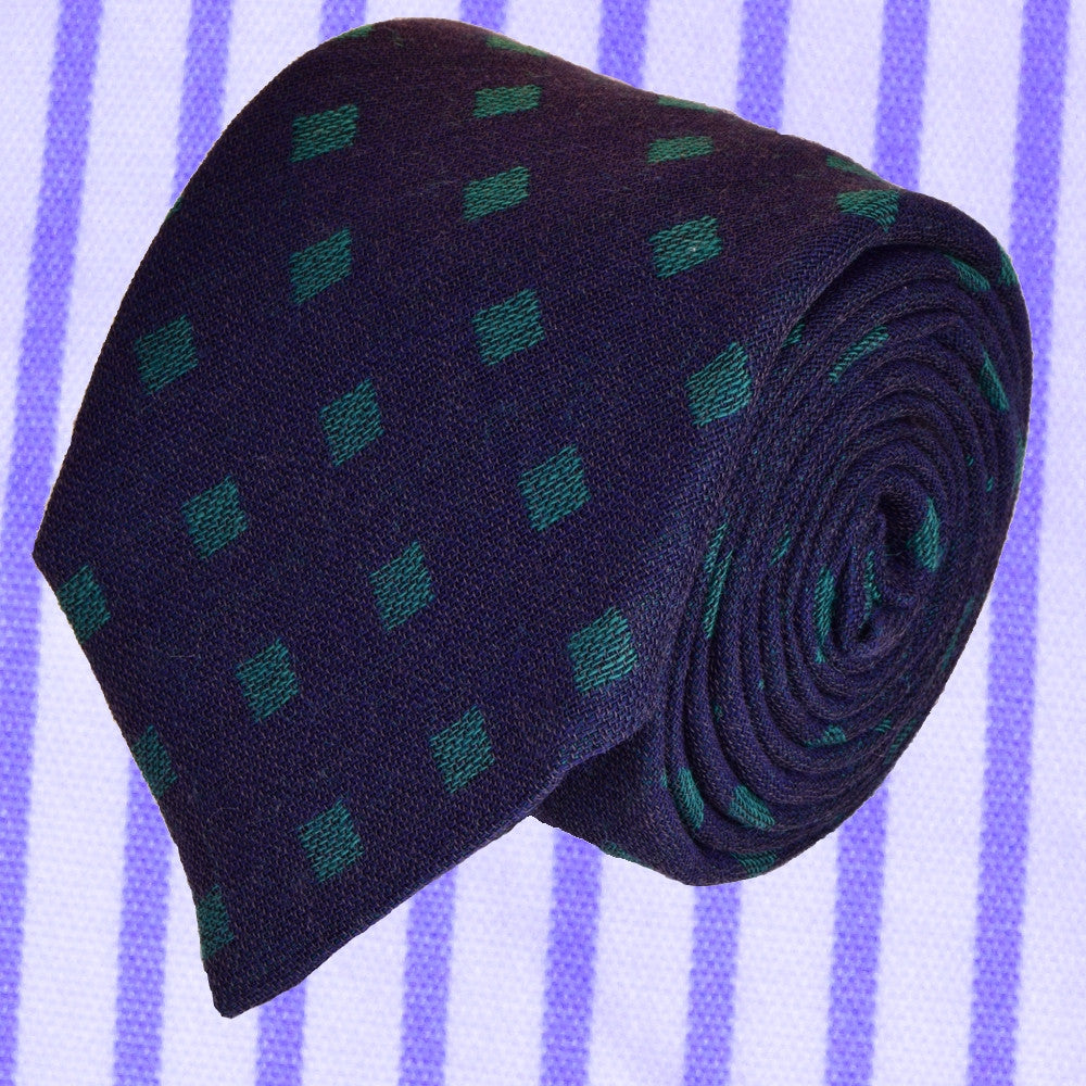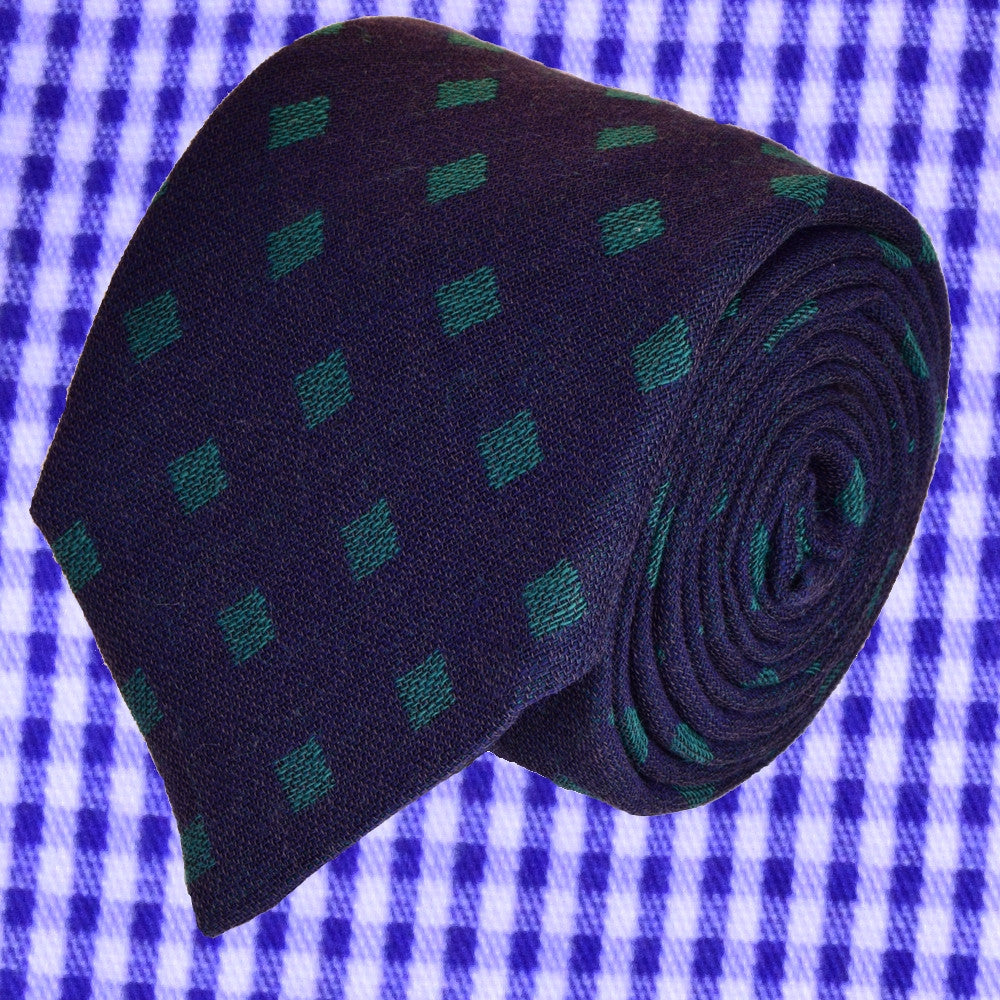 INDIGO-BLUE WOOL NECKTIE HANDMADE IN ITALY, DIAMOND PATTERNS IN PARADISO GREEN, BASKETWEAVE FABRIC - CRAVATTA IN LANA FATTA A MANO IN ITALIA, BLU INDIGO CON ROMBI VERDE PARADISO, FINITURA A CANESTRO - TIESHOPROMA