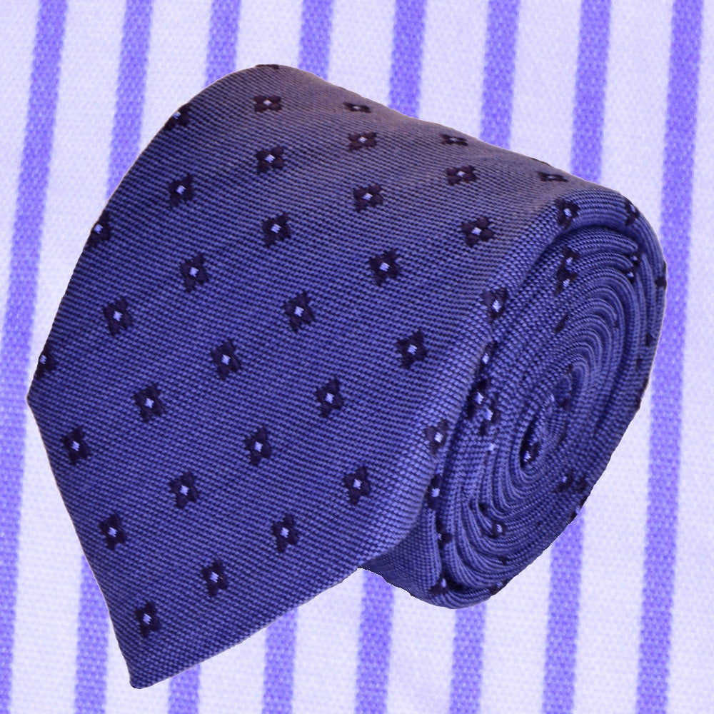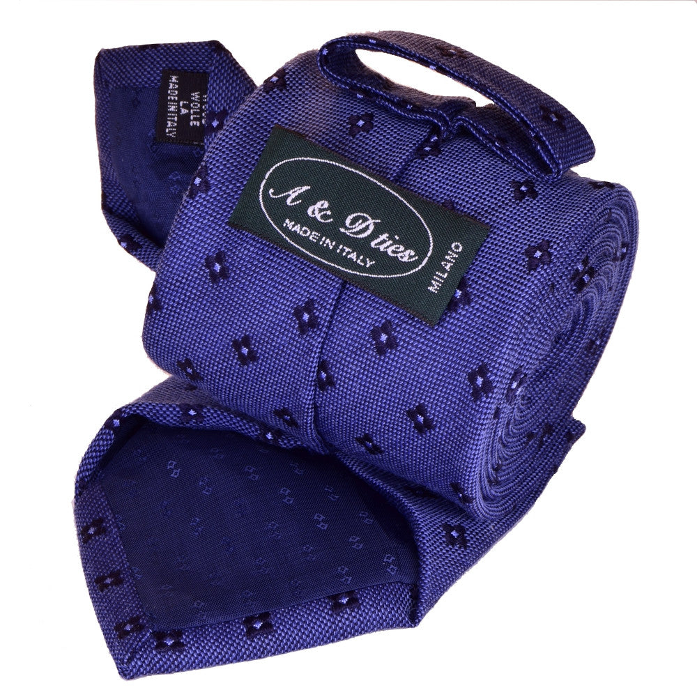 VIOLET-BLUE WOOL NECKTIE, NAVY BLUE FLOWER MOTIFS, HANDMADE IN ITALY BASKET WEAVE FABRIC - CRAVATTA IN LANA BLU-VIOLACEO FATTA A MANO IN ITALIA, MOTIIVI FLOREALI BLU NAVY, TESSITURA A CANESTRO