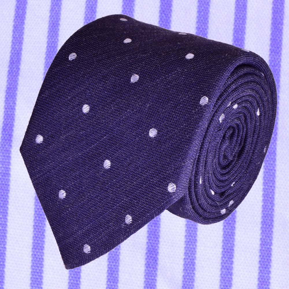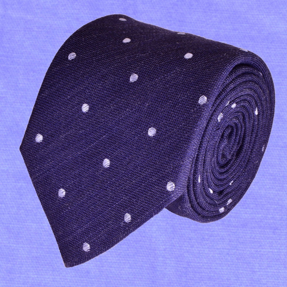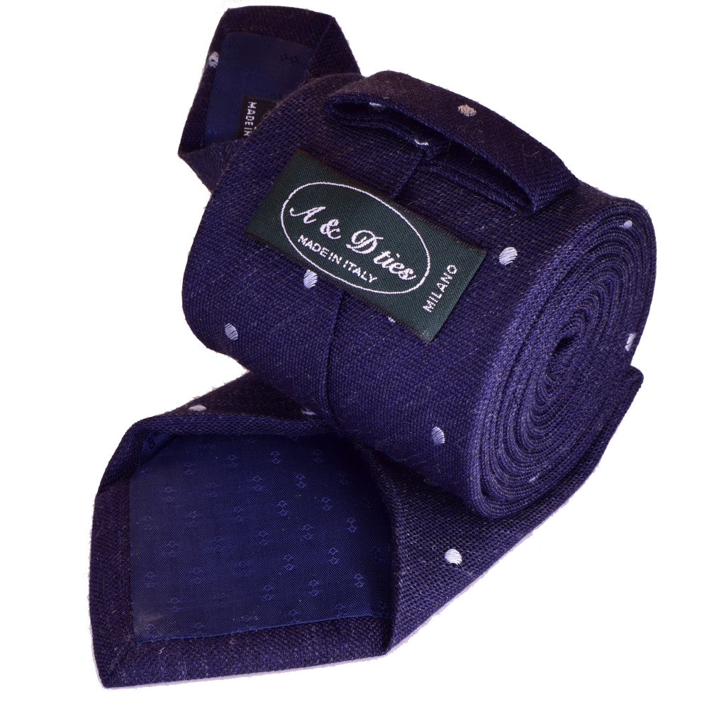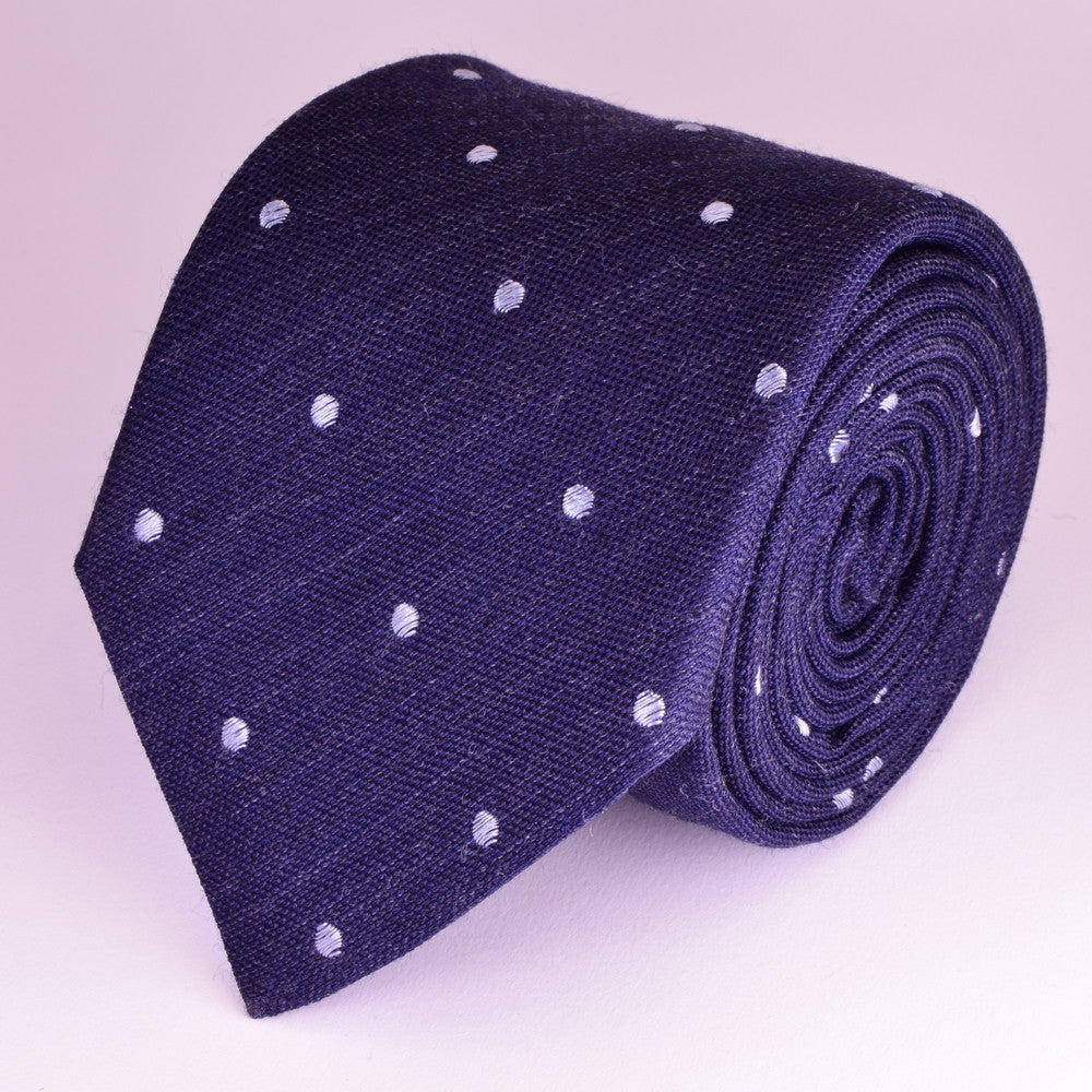 TOLOPE-BLUE, POLKA-DOTS, WOOL NECKTIE HANDMADE IN ITALY BASKETWEAVE FABRIC- CRAVATTA IN LANA BLU TOLOPEA E POIS GRANDI, FINITURA A CANESTRO